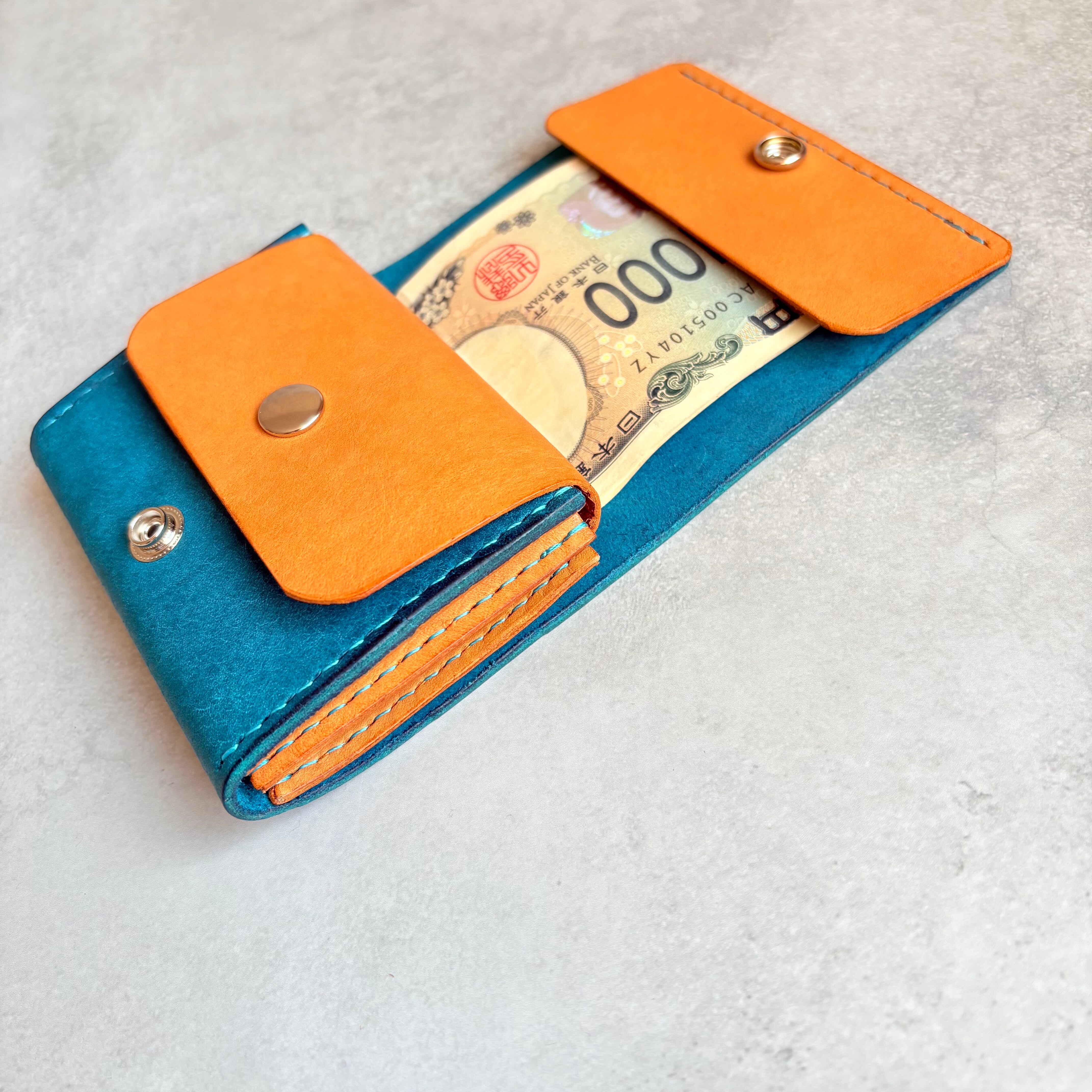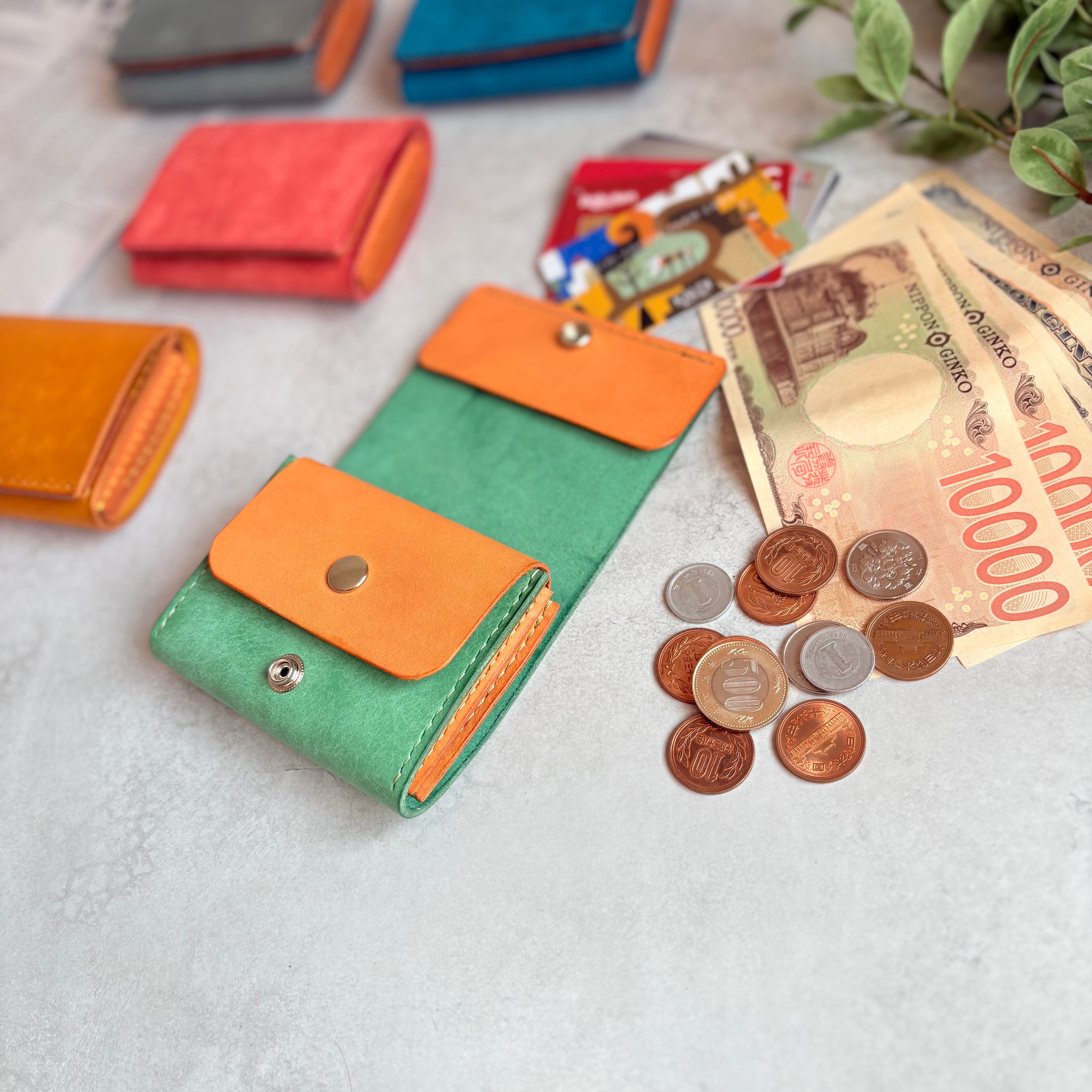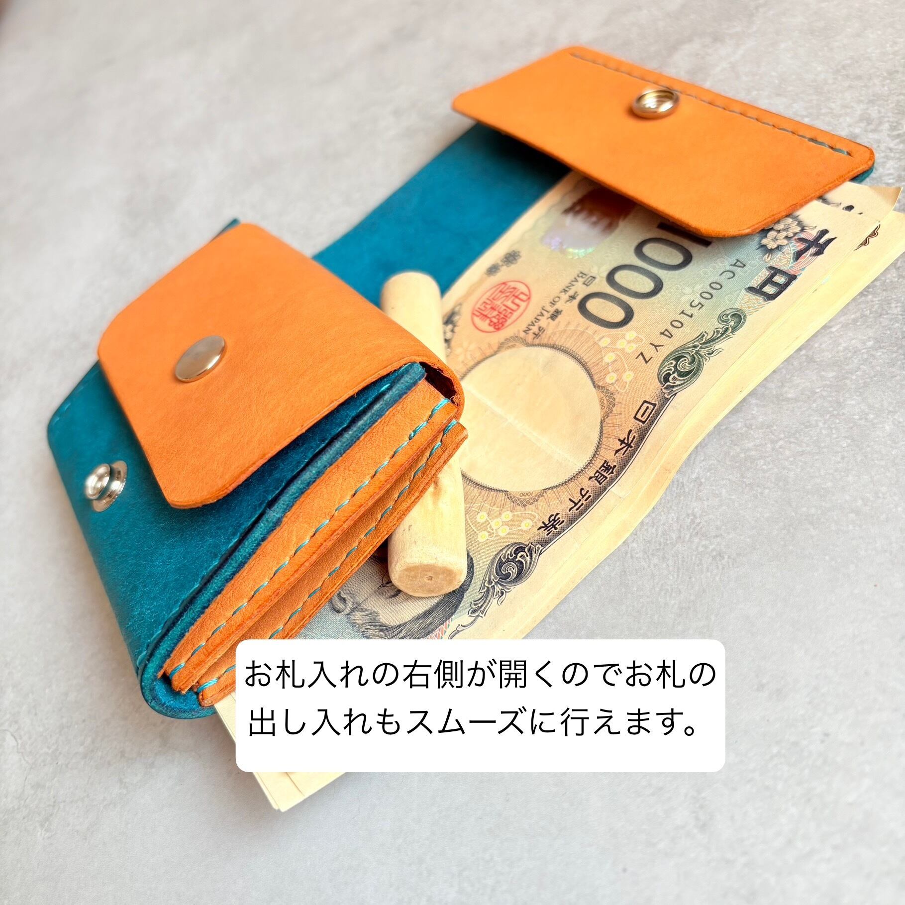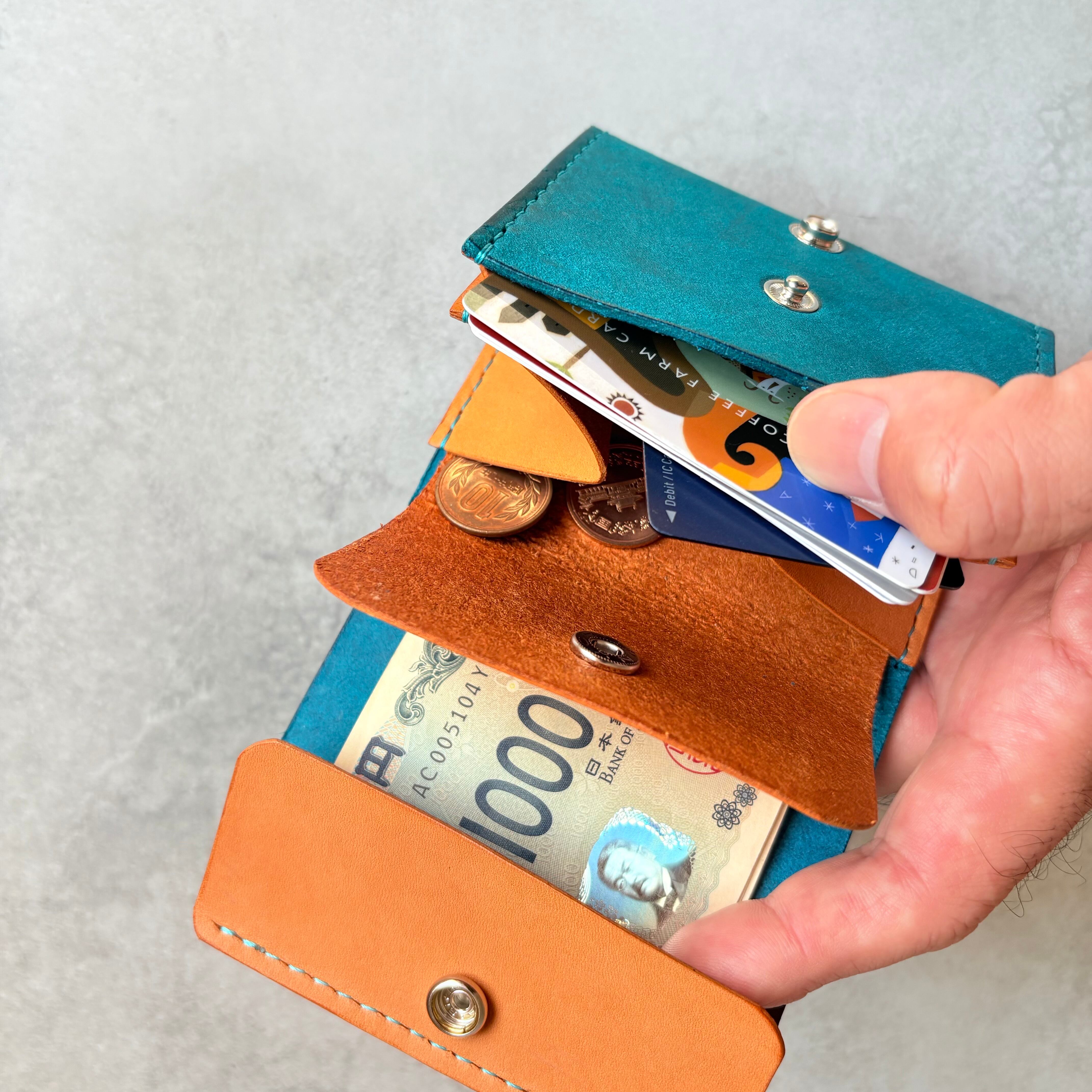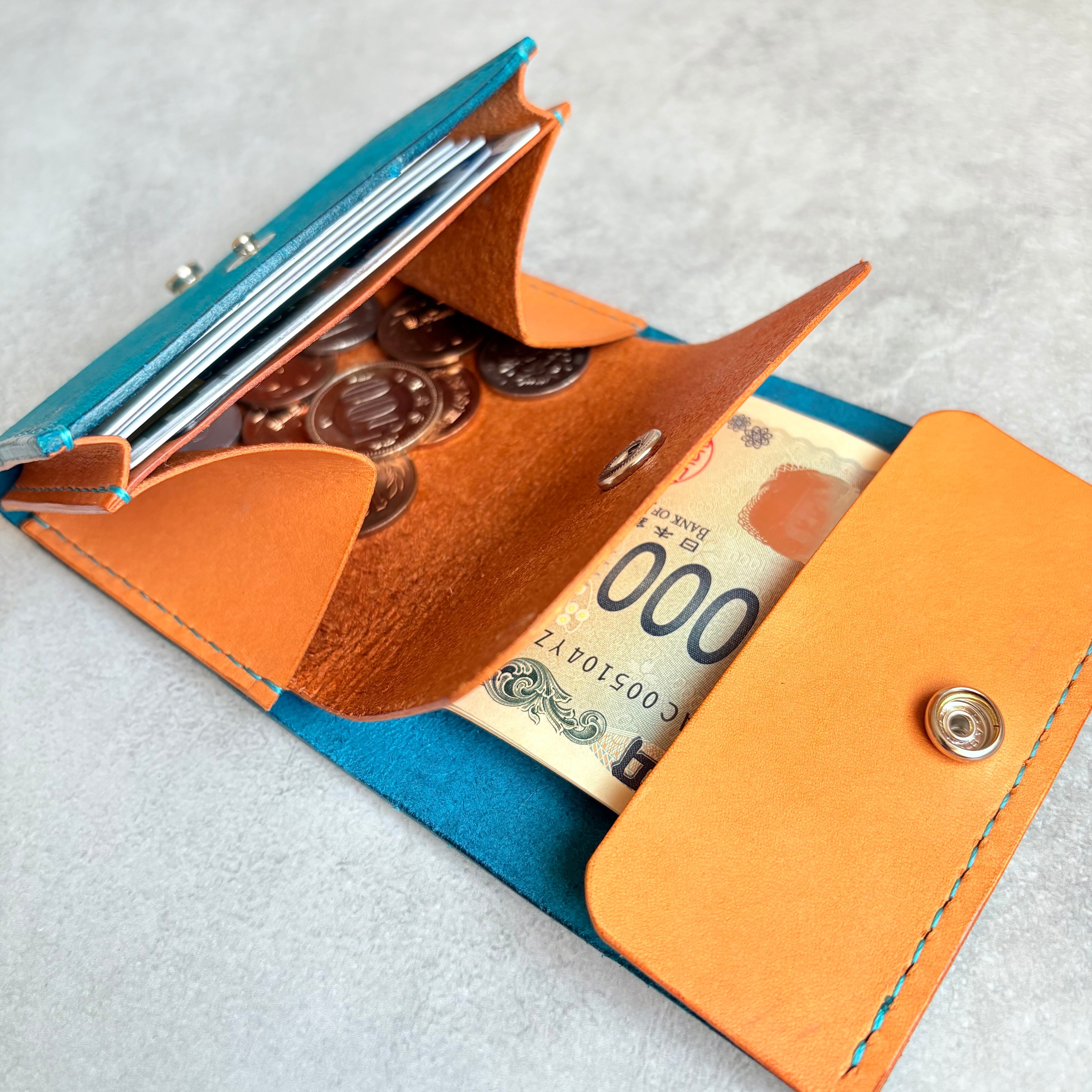 小銭、カード入れ部分には開けやすいようにバネホックを本体にはカバンの中でも開かないようジャンパーホックを使用しています。