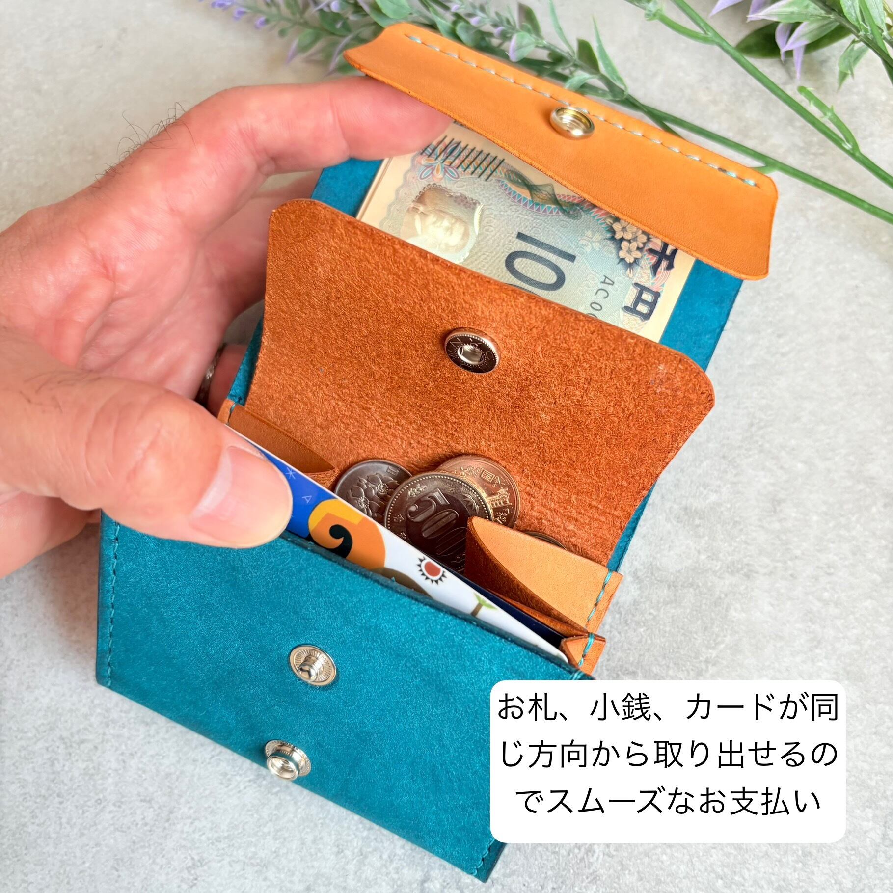 ワンタッチで財布を開くと同じ向きでお札、小銭、カードを取り出せ会計時にスムーズなお支払いができます。