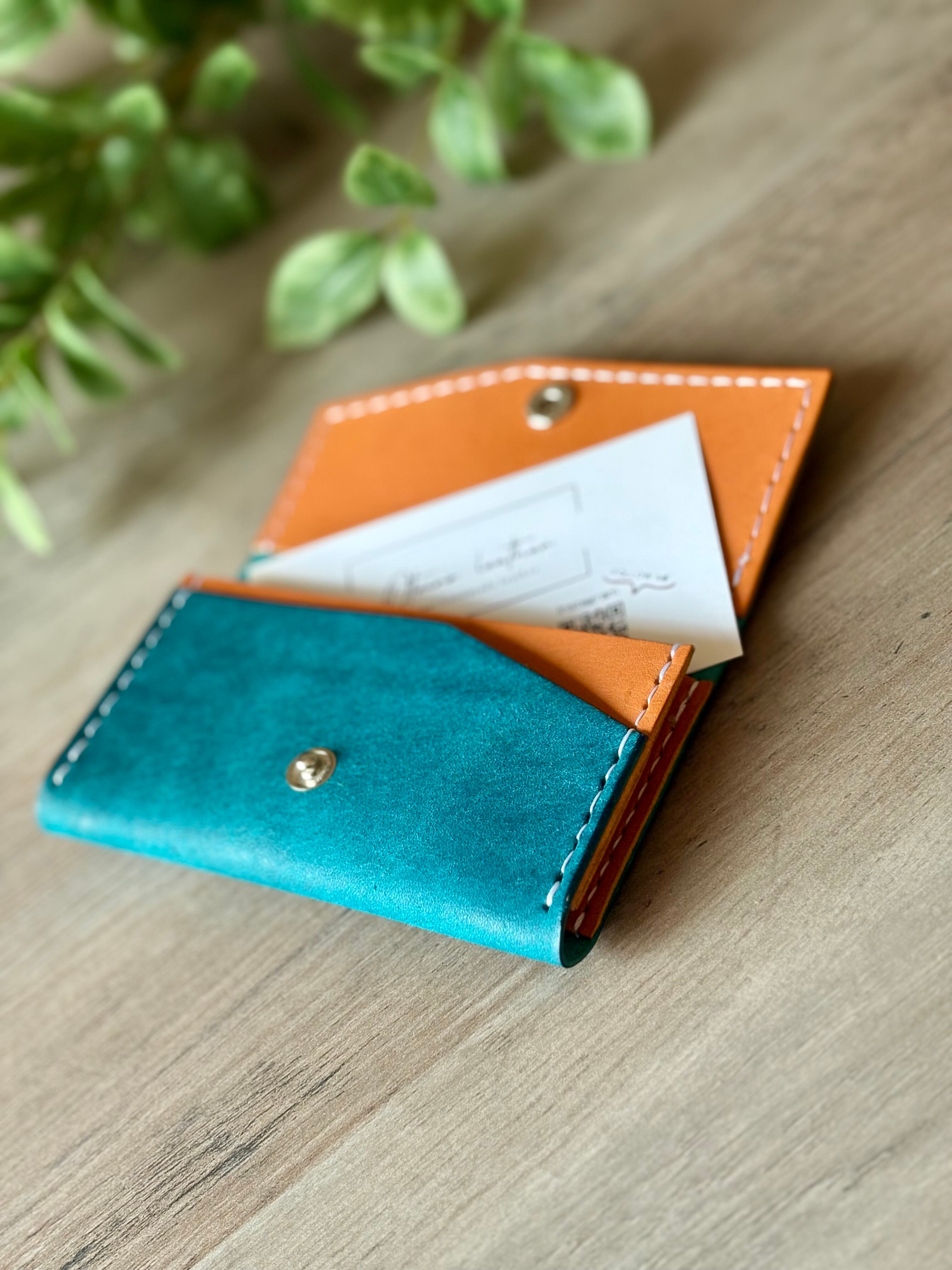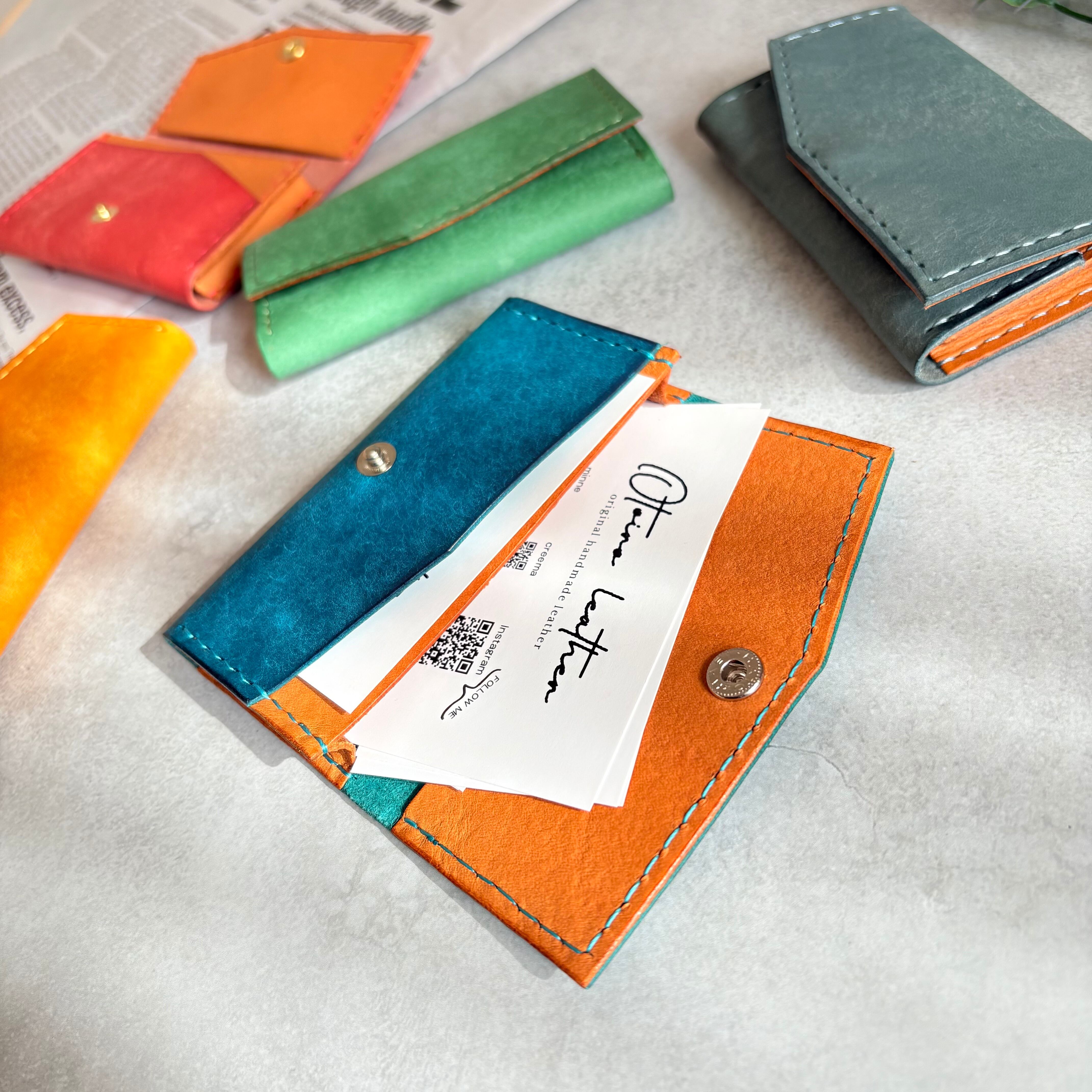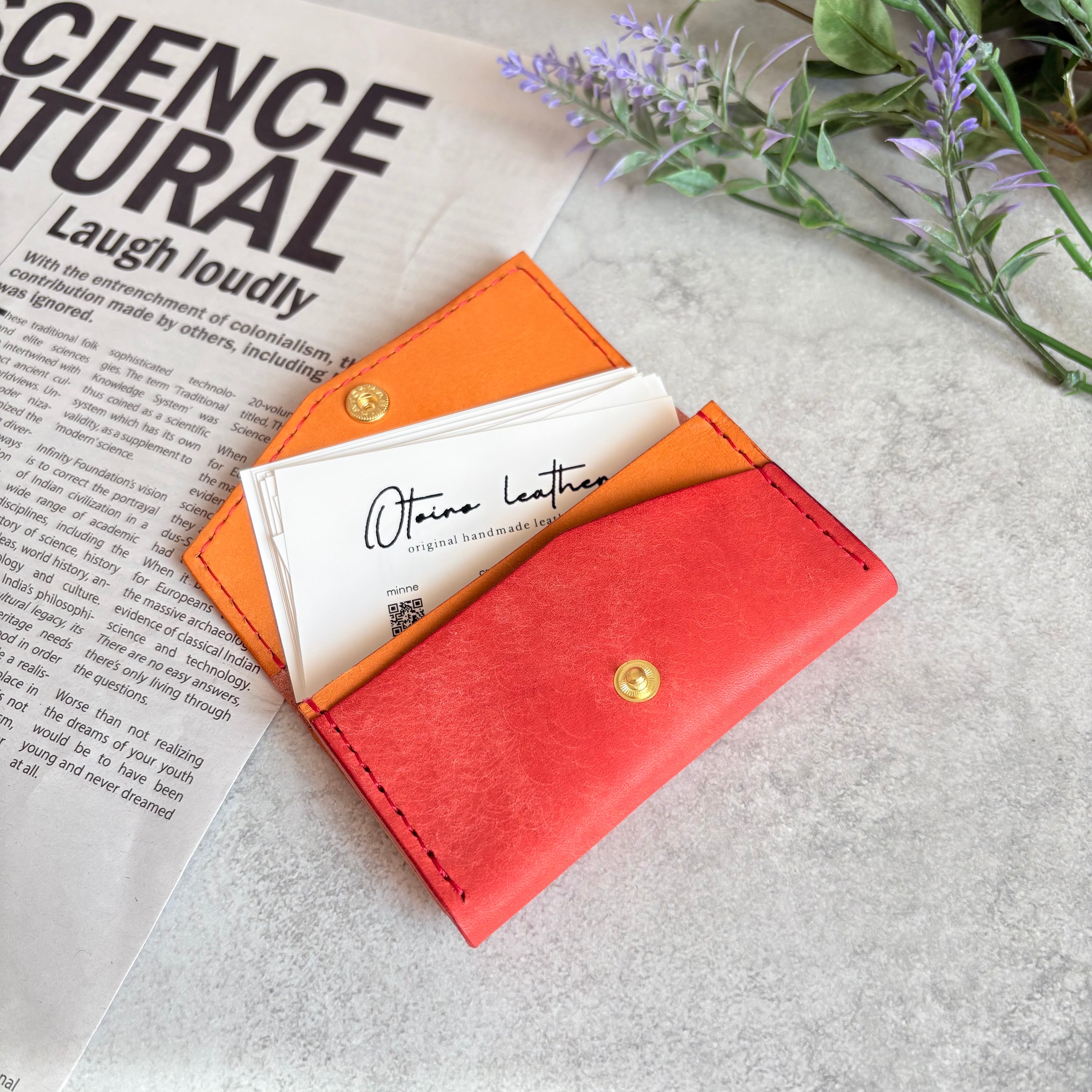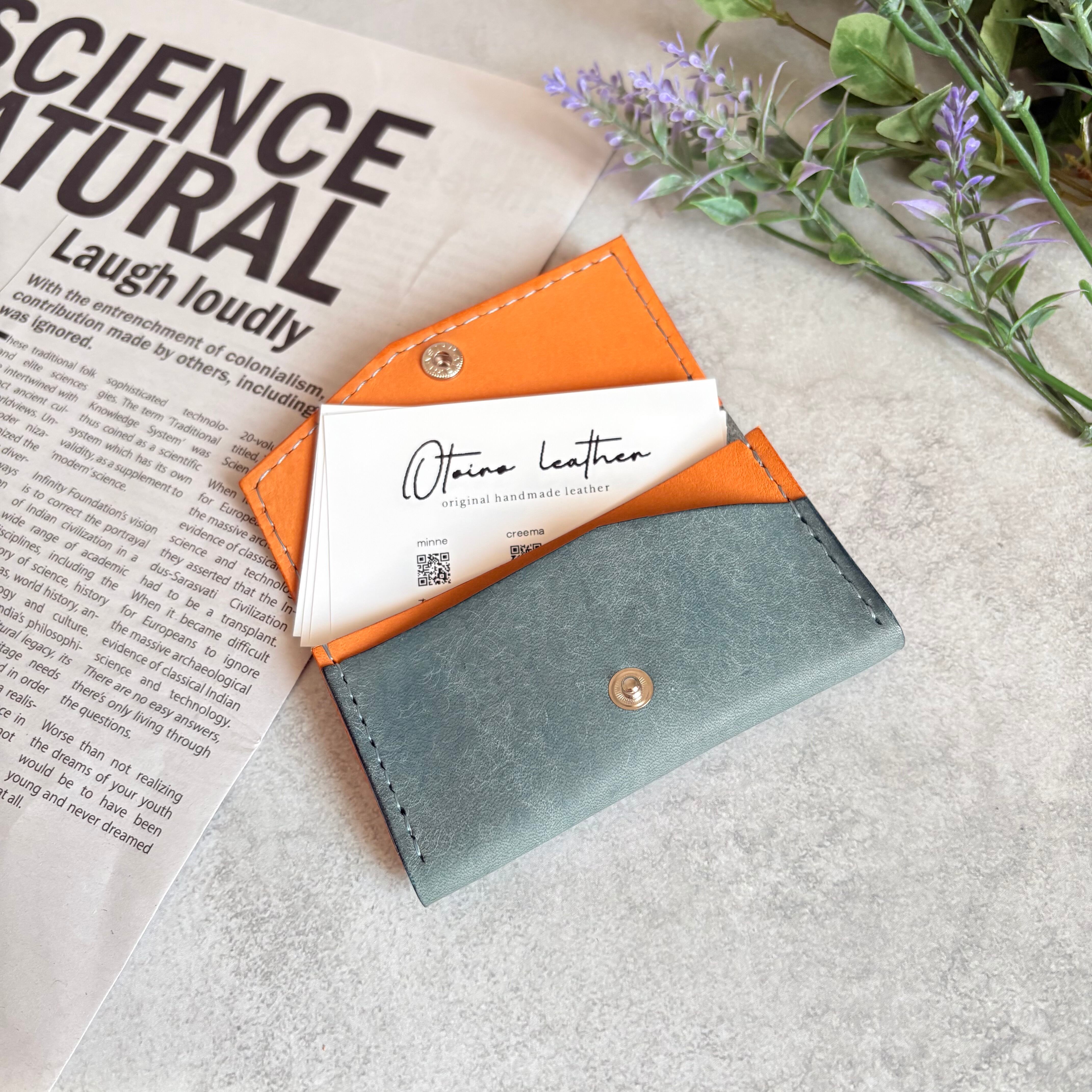 外装にイタリア製 スクラッチレザー、内装に国産ヌメ革を使用した鮮やかな発色が特徴の2層式名刺入れ・カードケースになります。
