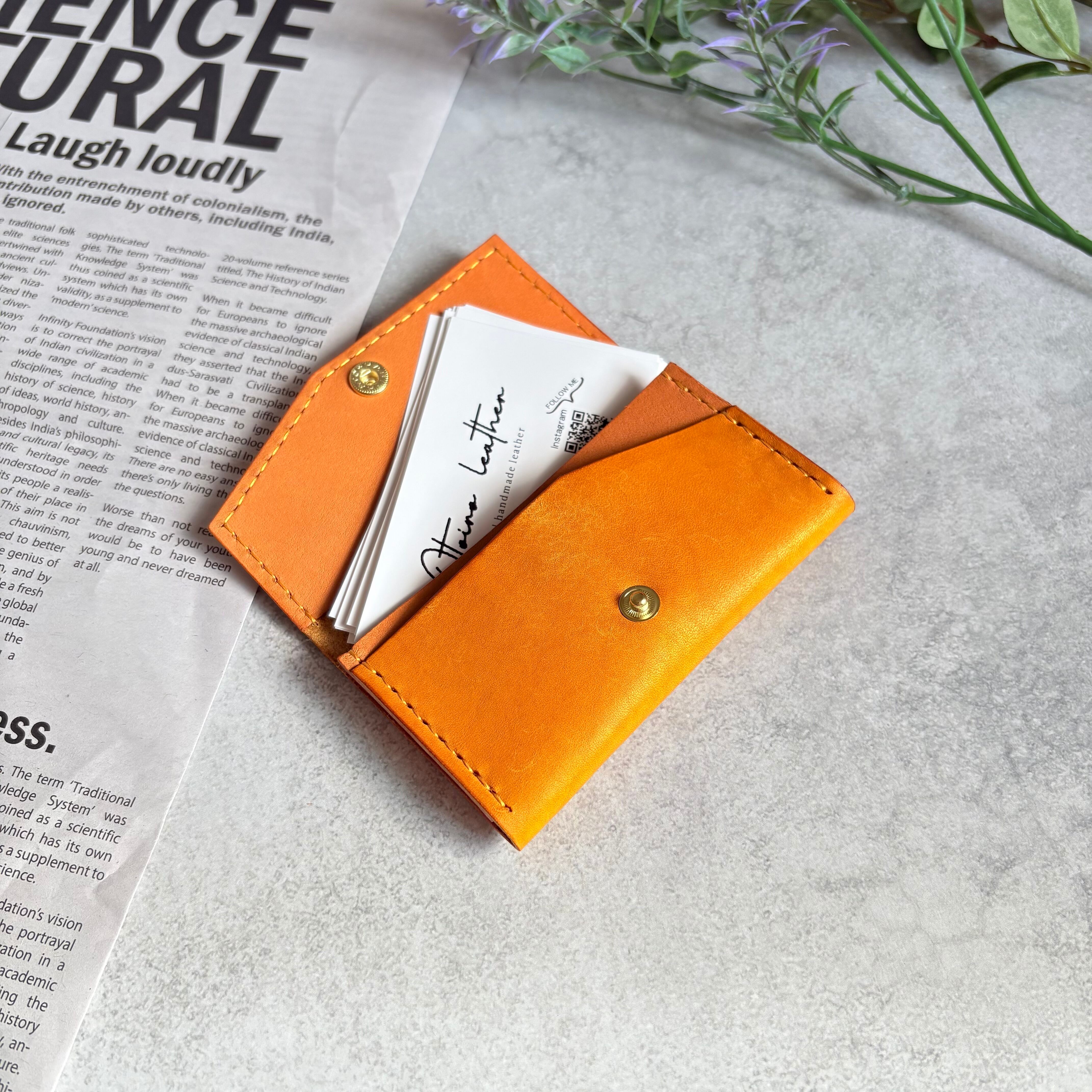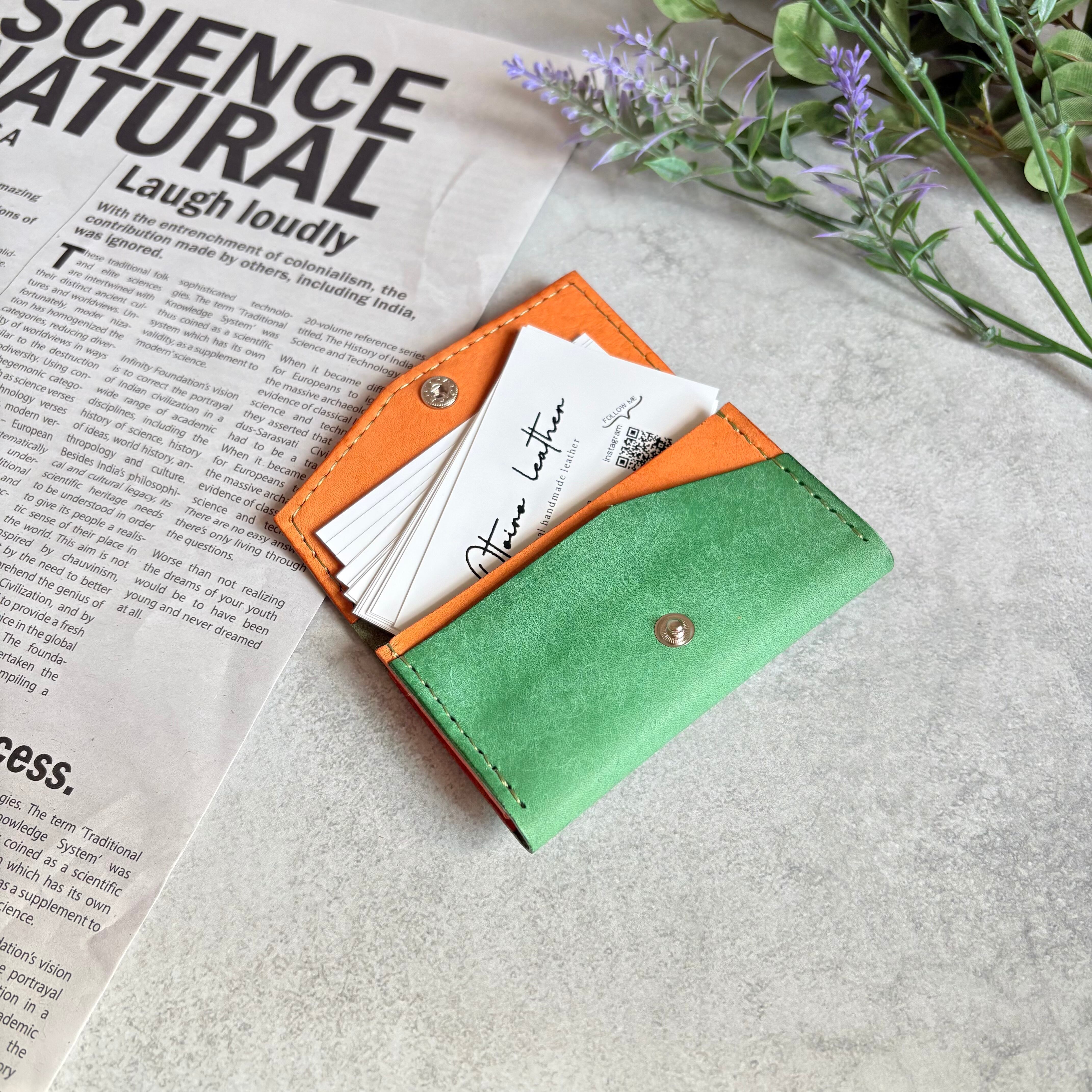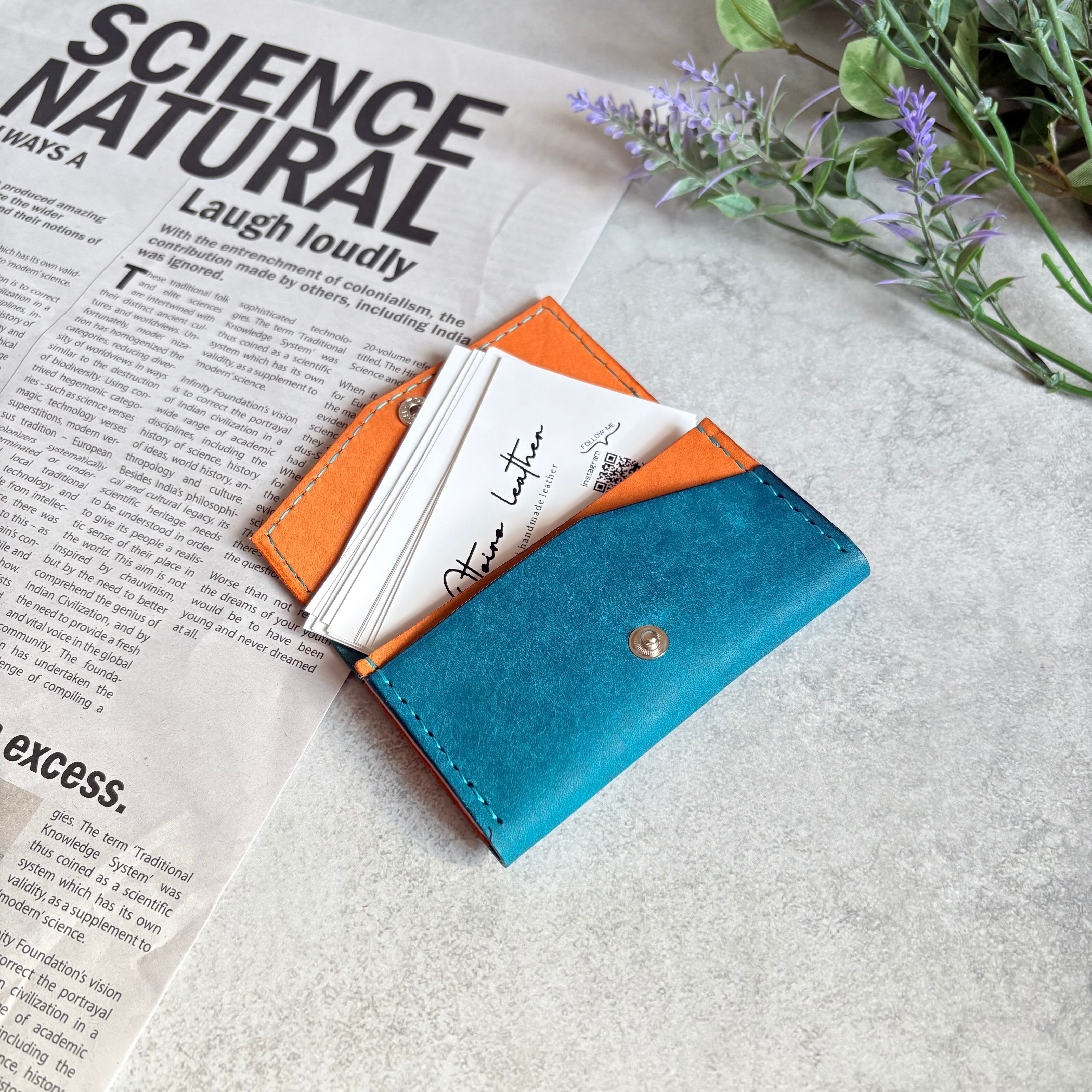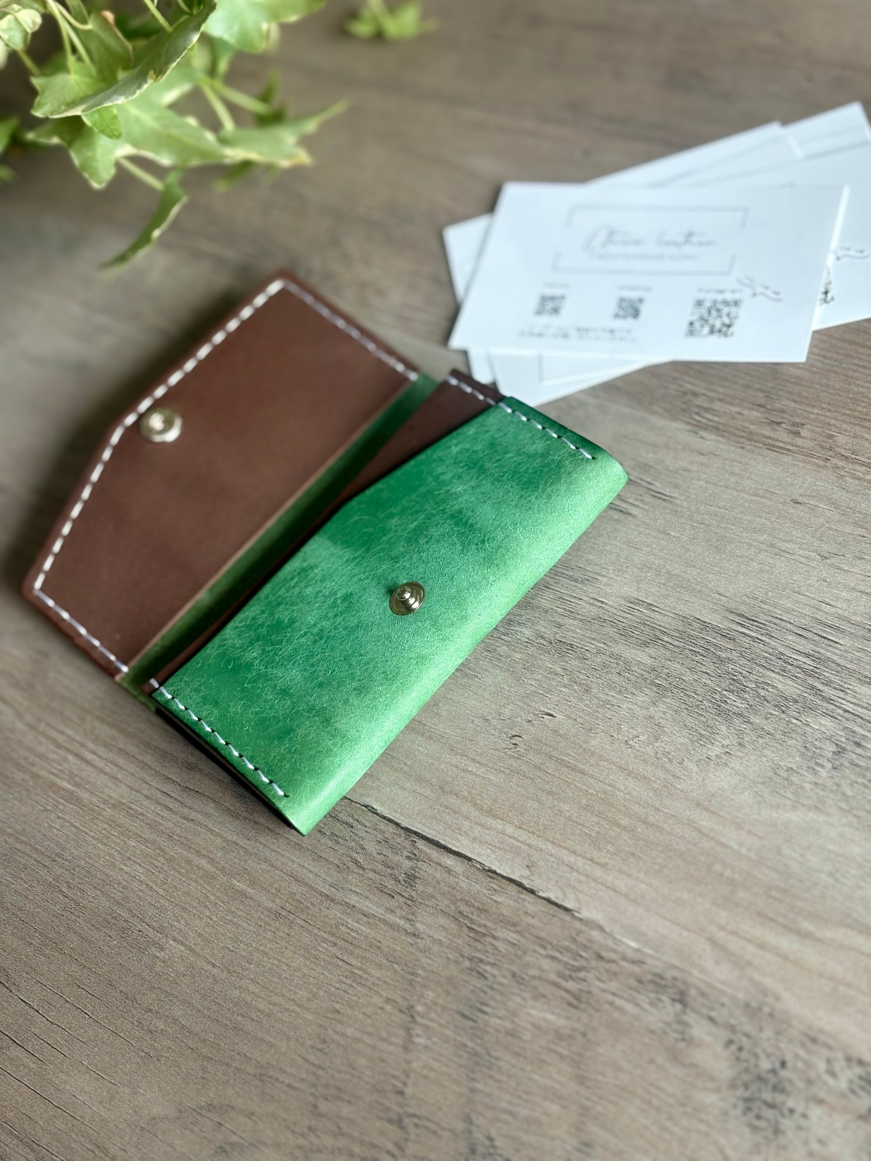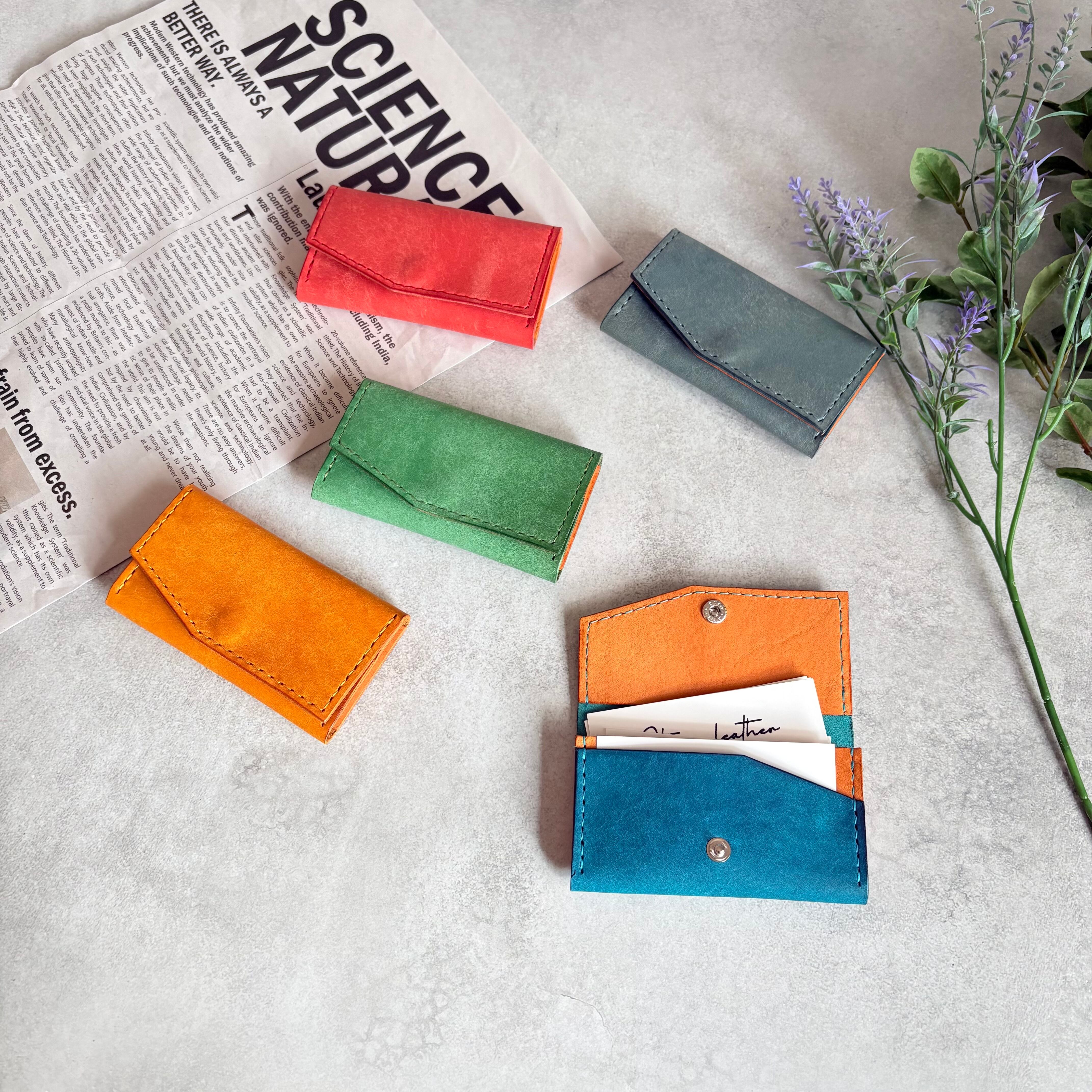 外装にイタリア製 スクラッチレザー、内装に国産ヌメ革を使用した鮮やかな発色が特徴の2層式名刺入れ・カードケースになります。