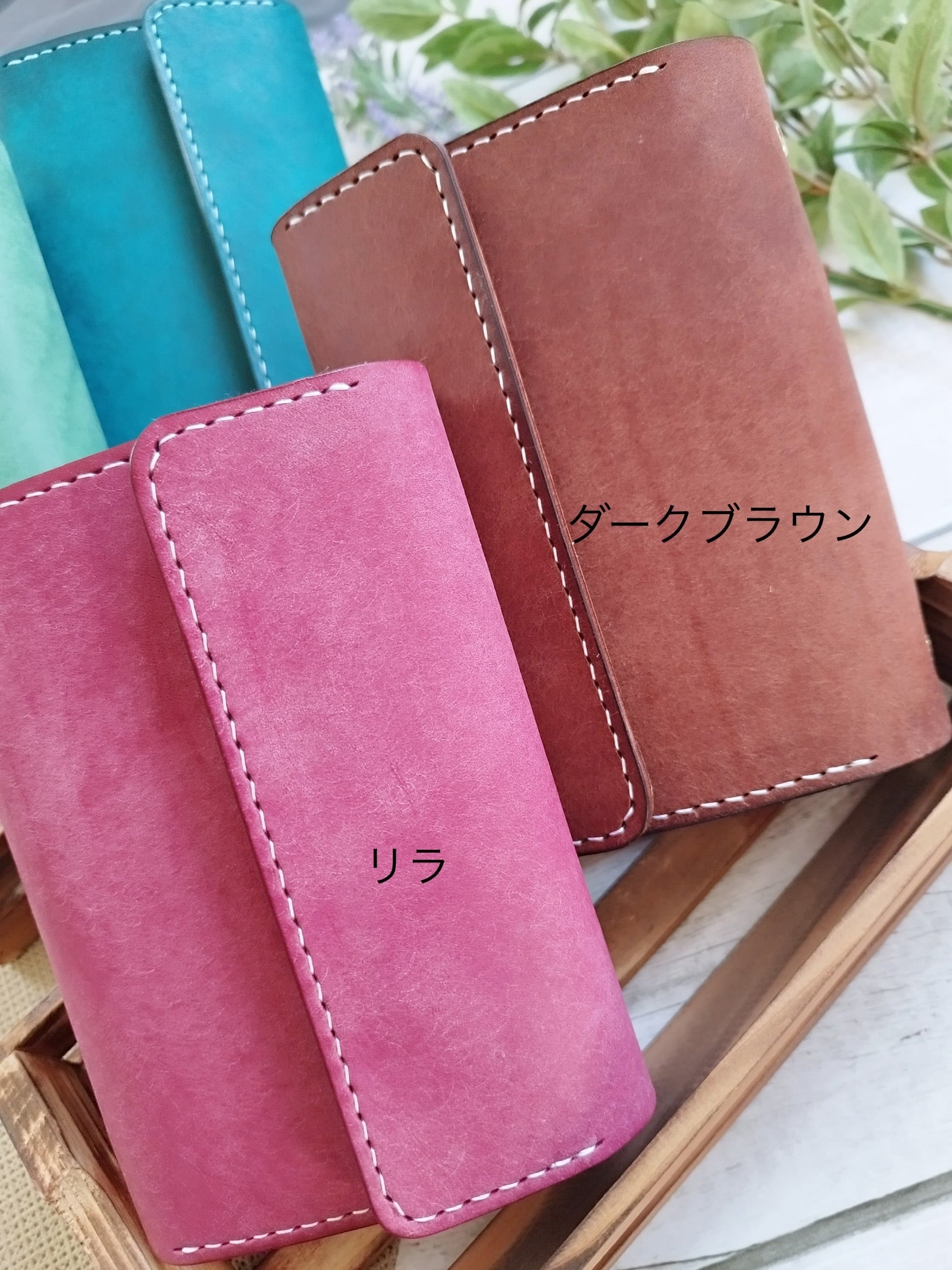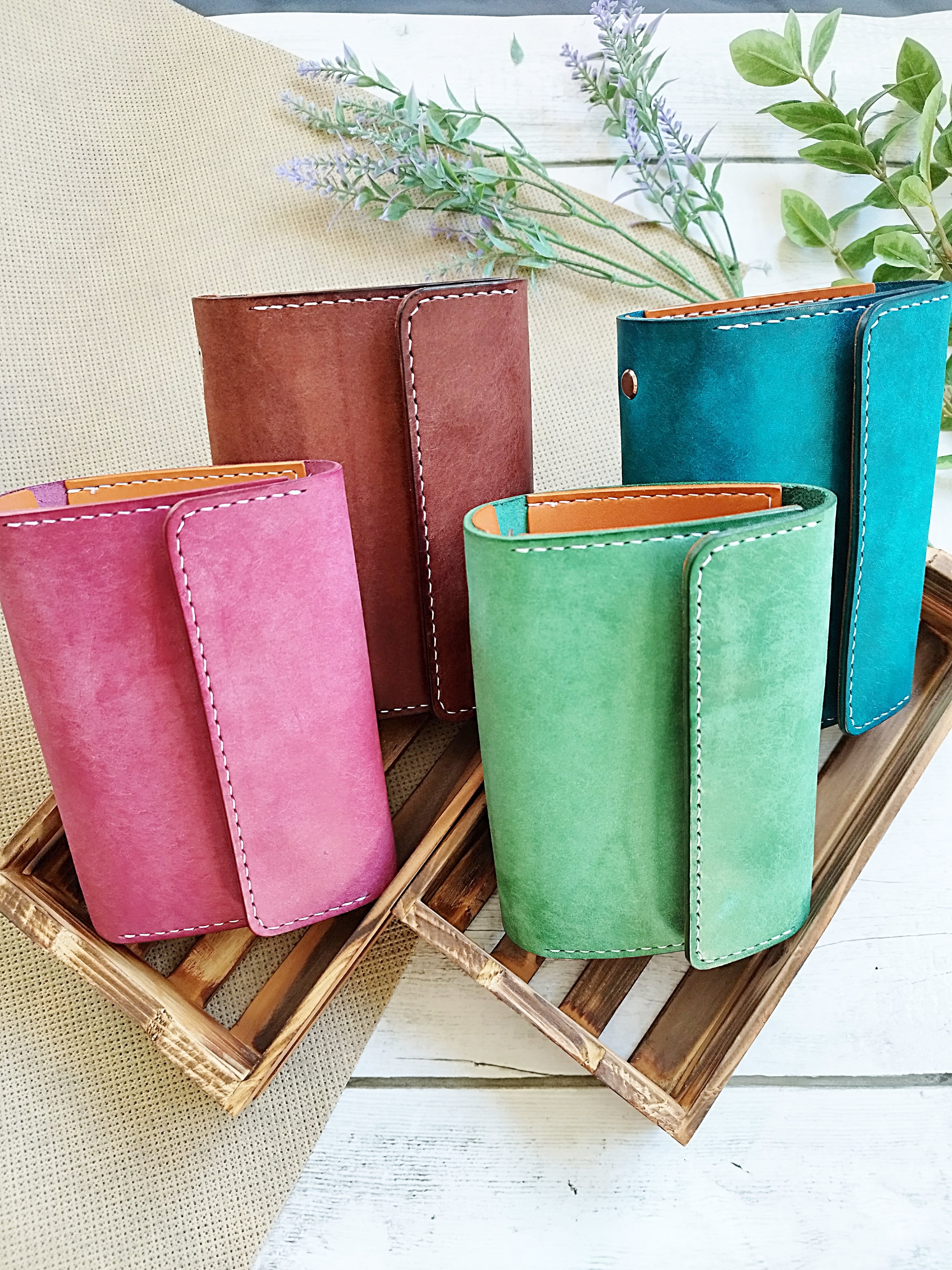 カラーはビジネスでもプライベートでもご使用していただけるようトルケーゼ(ターコイズ)、メンタ(グリーン)、リラ(紫)、ダークブラウンの4色展開で、お好みやシーンに合わせて選べるのも魅力。使い込むほどに風合いが増すので、長く愛用できる逸品です。